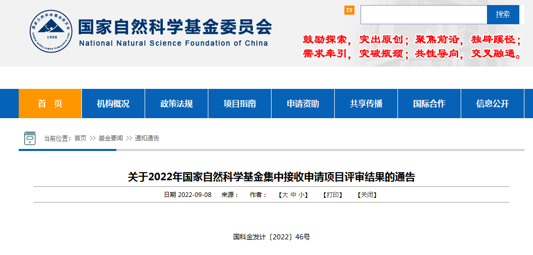 關于2022年國家自然科學基金集中接收申請項目評審結果的通告