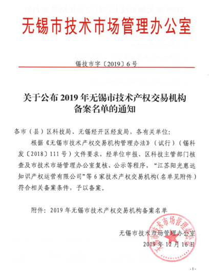 江蘇陽光惠遠知識產權運營有限公司是首批獲得備案的無錫市技術產權交易機構。根據《無錫市技術轉移機構和技術經紀(經理)人備案辦法(試行)》,技術經紀人需掛靠已備案的技術轉移機構。歡迎相關技術經紀(經理)人掛靠陽光惠遠。