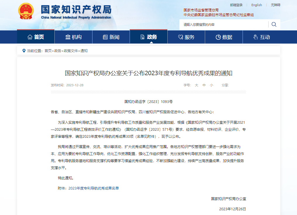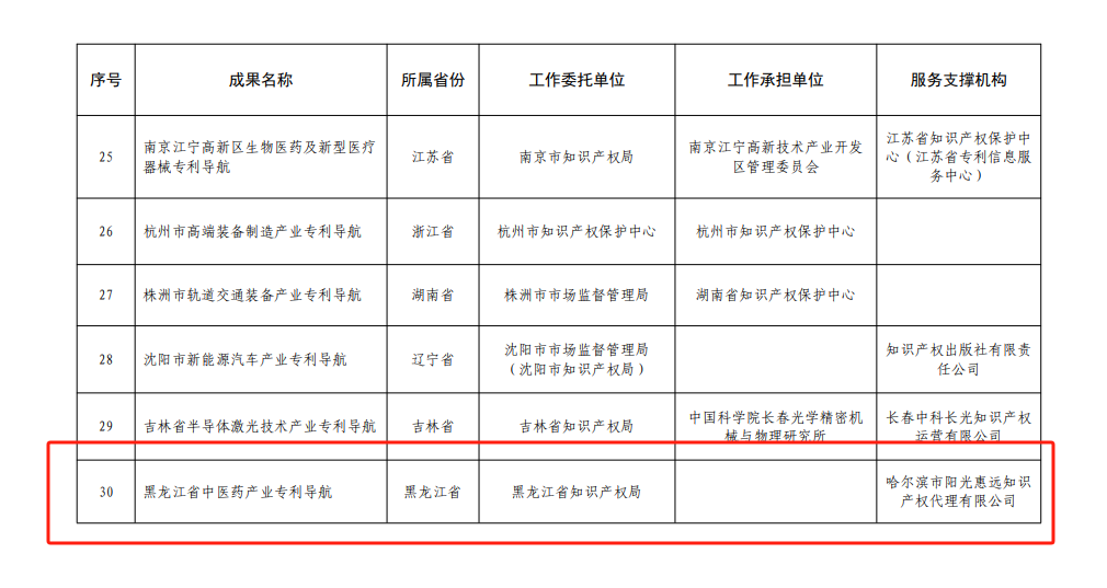 2023年12月28日,《2023年度專(zhuān)利導(dǎo)航優(yōu)秀成果》名單正式由國(guó)家知識(shí)產(chǎn)權(quán)局公布,其中由哈爾濱市陽(yáng)光惠遠(yuǎn)知識(shí)產(chǎn)權(quán)代理有限公司承擔(dān)的專(zhuān)利導(dǎo)航項(xiàng)目《黑龍江省中醫(yī)藥產(chǎn)業(yè)專(zhuān)利導(dǎo)航》榮獲此殊榮。