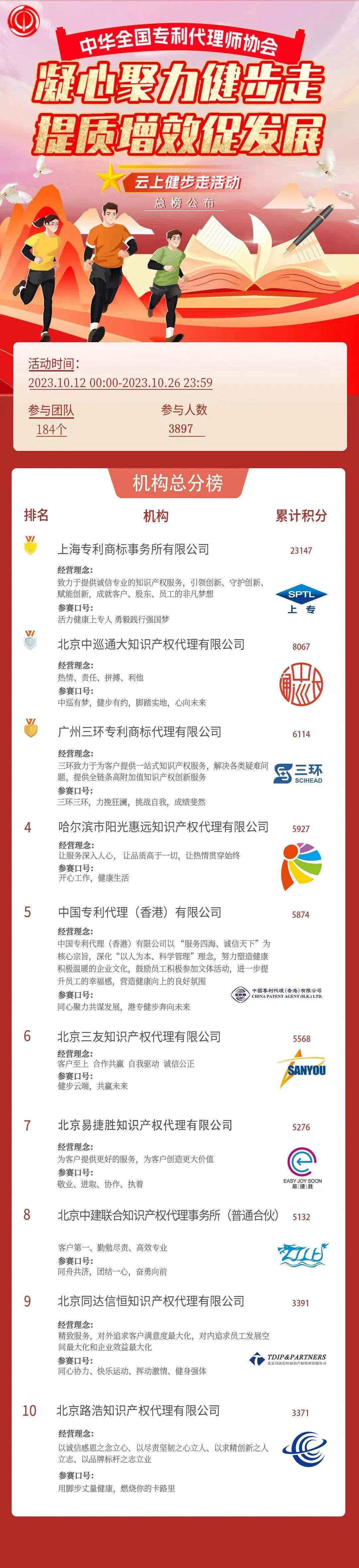 熱烈祝賀陽光惠遠知識產權(哈爾濱)在中華全國專利代理師協會舉辦的“凝心聚力健步走 提質增效促發展”云上健步走活動中獲得機構總分榜第四名的好成績!